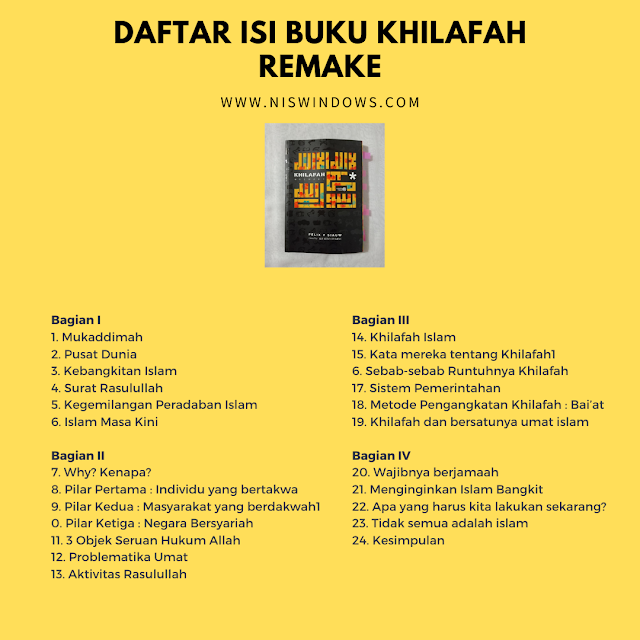 Dibagian ini dikasih tau peta-peta kepemimpian para khilafah berikut dengan infografis seluruh nama khilafah yang ada. Terus nanti ada pembahasan mengapa khilafah bisa runtuh, sistem pemerintahan khilafah zaman dulu seperti apa, dan metode pengangkatan bai’atnya.